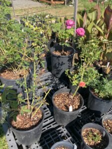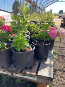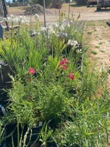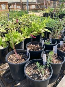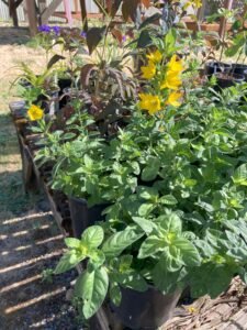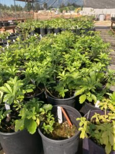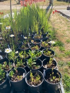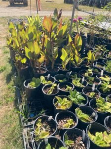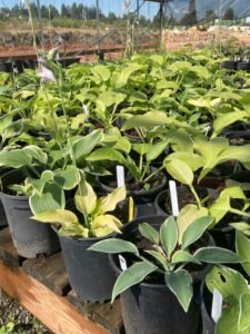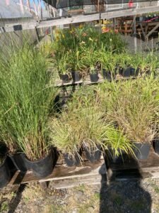 Some of the perennials include Ajuga, Bergenia, Filipendula, Hosta, Heuchera, Sweet woodruff, numerous variety of grasses, Epimedium, Hydrangea, Pachysandra, Myrtle shrubs, Variegated Boxwood, Shasta Daisy, Crocosmia Lucifer, Campanula, Canna, Agapanthus, Goldenrod, Phlox, Aster, Tradescantia, Stachys macrantha, Black Mondo Grass, Persicaria, Daylily, Bearded Iris, Coreopsis, Red Vein Sorrel.
